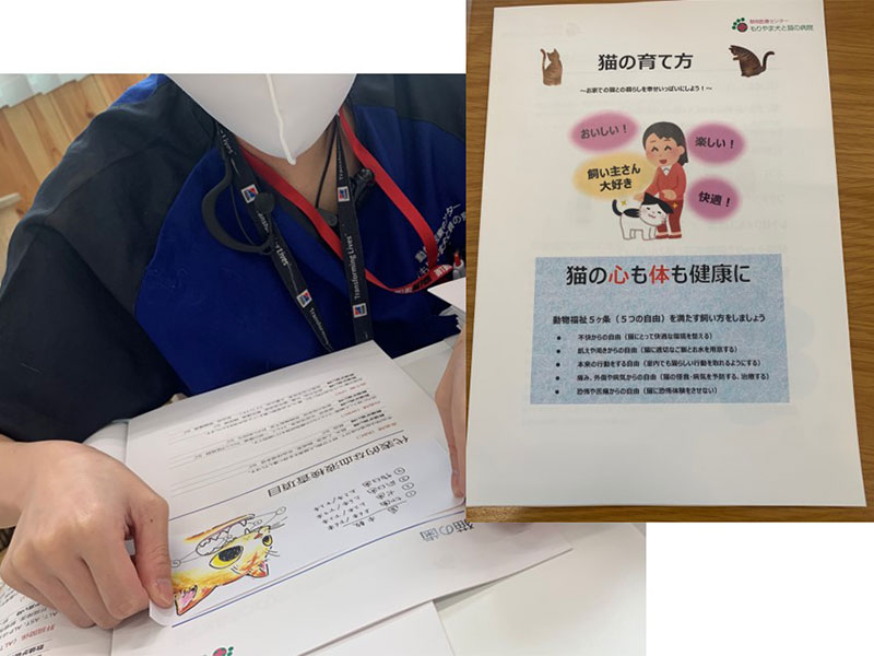 猫専用のオリジナル見まもり手帳は、猫との暮らし方や災害時の備え、かかりやすい病気などをわかりやすく解説したオリジナルの冊子。猫を初めて病院に連れてきたご家族さまに渡すために作成したが、今回、健診を受診した猫のご家族さまにプレゼントした。 |