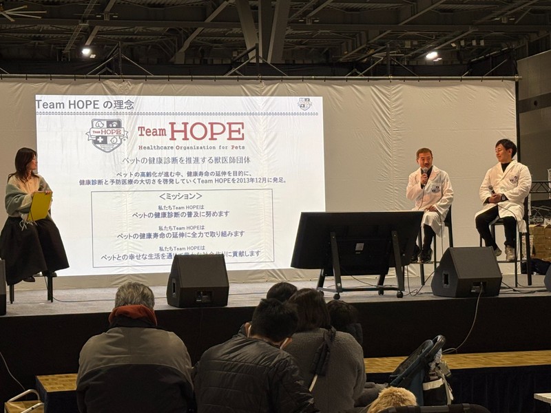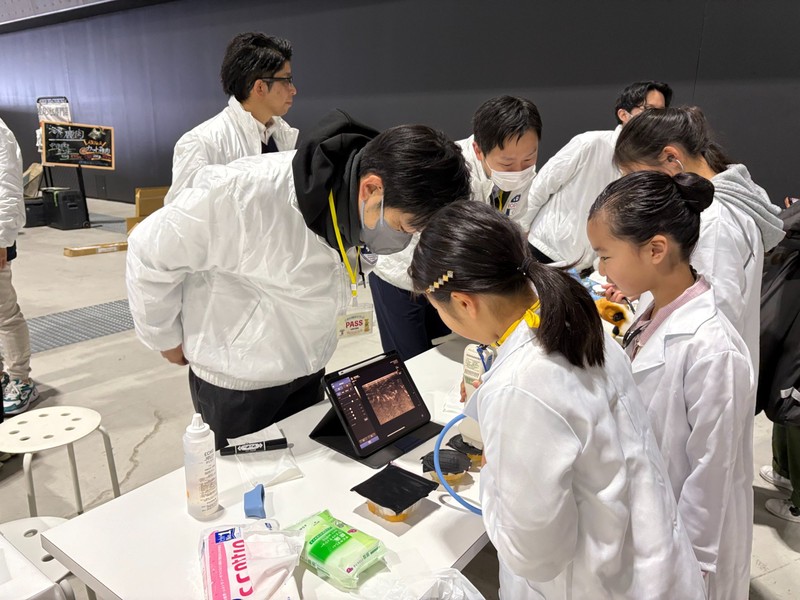 ペットの健康相談では99組のご家族から健康管理や普段の生活の中で気になっていることについて相談をお受けしました。子ども獣医師体験では60名の子どもたちが聴診やエコー検査を体験しました。特設ステージでは上條圭司代表と淺井亮太副代表による健康診断についてのトークショーも行われ、最後のじゃんけん大会もおおいに盛り上がりました。