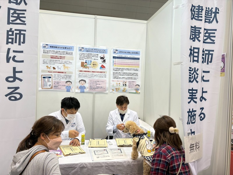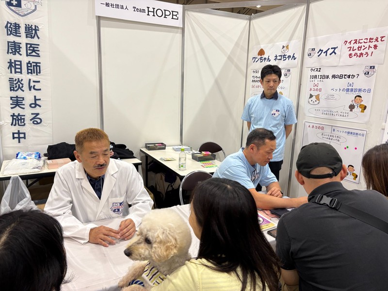 日本最大級のペット産業見本市において、獣医師による健康相談会を実施しました。関東地区委員を中心に多くの先生方が交代で参加され、日頃ご家族が感じている健康面の不安や疑問にアドバイスを行いました。また公式LINEアカウントの紹介を行い、200名以上の来場者に登録いただきました。