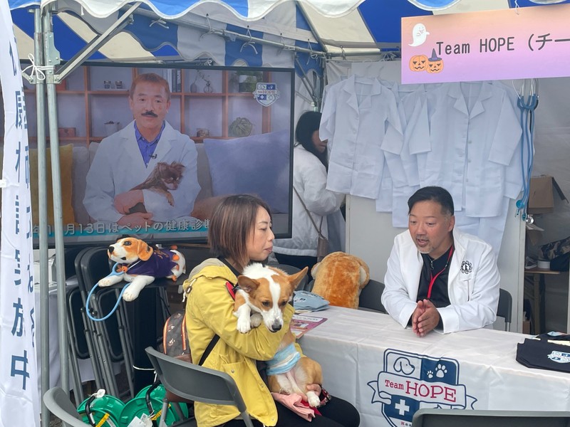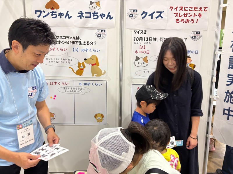 今年は会場を郊外に移しての開催でしたが、予想を上回る多くの方が犬猫同伴で来場され、大にぎわいの1日となりました。獣医師による健康相談会を実施し、上條圭司代表と北海道地区委員長の石原創先生にご対応いただき、30家族に健康アドバイスを行いました。キッズ向けクイズやLINE登録のご案内も実施しました。