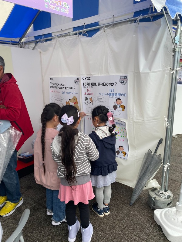 小雨の降る天候でしたが、たくさんのご家族にご来場いただきました。東北地区委員長の小泉先生による健康相談では15組の方がペットと暮らす上での様々な疑問や不安について相談されていました。 お子さんたちには、白衣を着て獣医師なりきりPHOTOスポットで撮影を楽しんだり、子供向けクイズに回答いただきました。